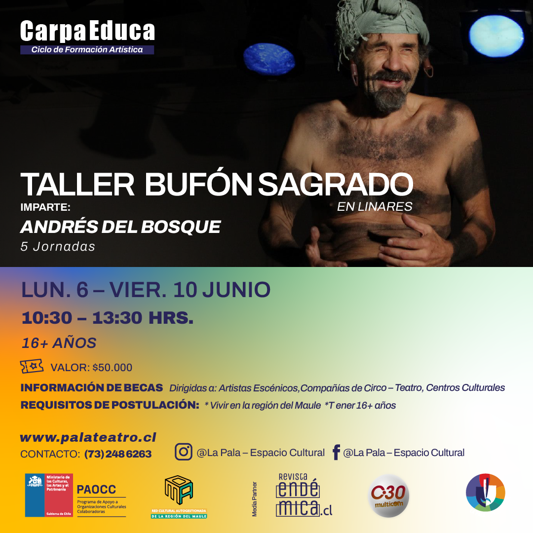 La Pala invita a artistas e integrantes de compañías de circo – teatro y centros culturales de la región del Maule, a ser parte del Taller de Bufón Sagrado que impartirá el doctor en artes escénicas Andrés Del Bosque. Las clases se realizarán desde el 6 al 10 de junio en Linares, teniendo un valor de adhesión de $50.000. El proceso de becas será anunciado a través de los soportes de difusión de La Pala- Espacio Cultural.