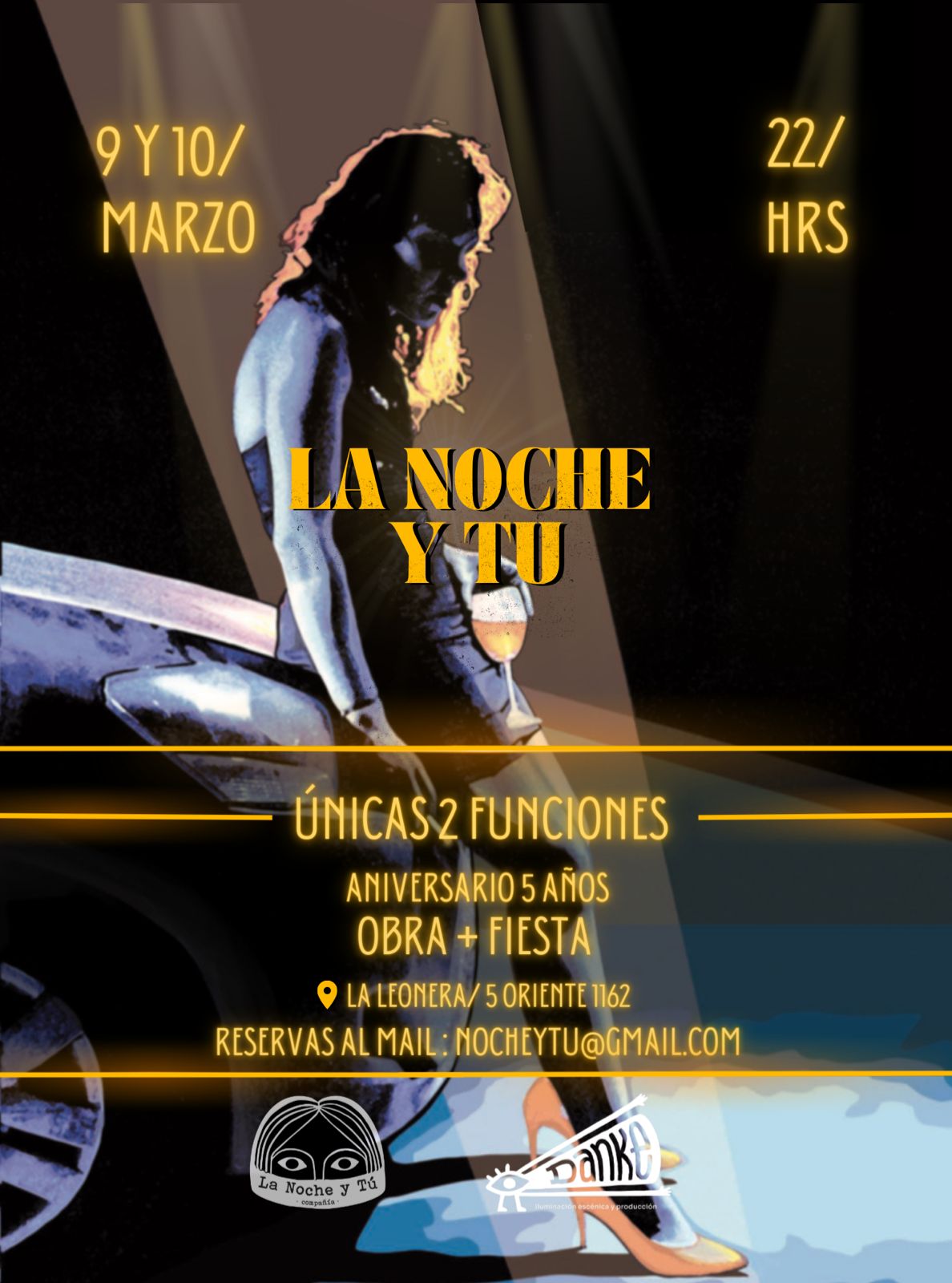 Cumplen 5 años y eso amerita festejarlo, por eso, la Compañía talquina La Noche y tú realizará 2 únicas funciones ¡y con elenco original! este 9 y 10 de marzo, las que incluyen fiesta. Estas presentaciones serán en La Leonera, ubicada en 5 oriente 1162 y tiene un valor de $5.000.