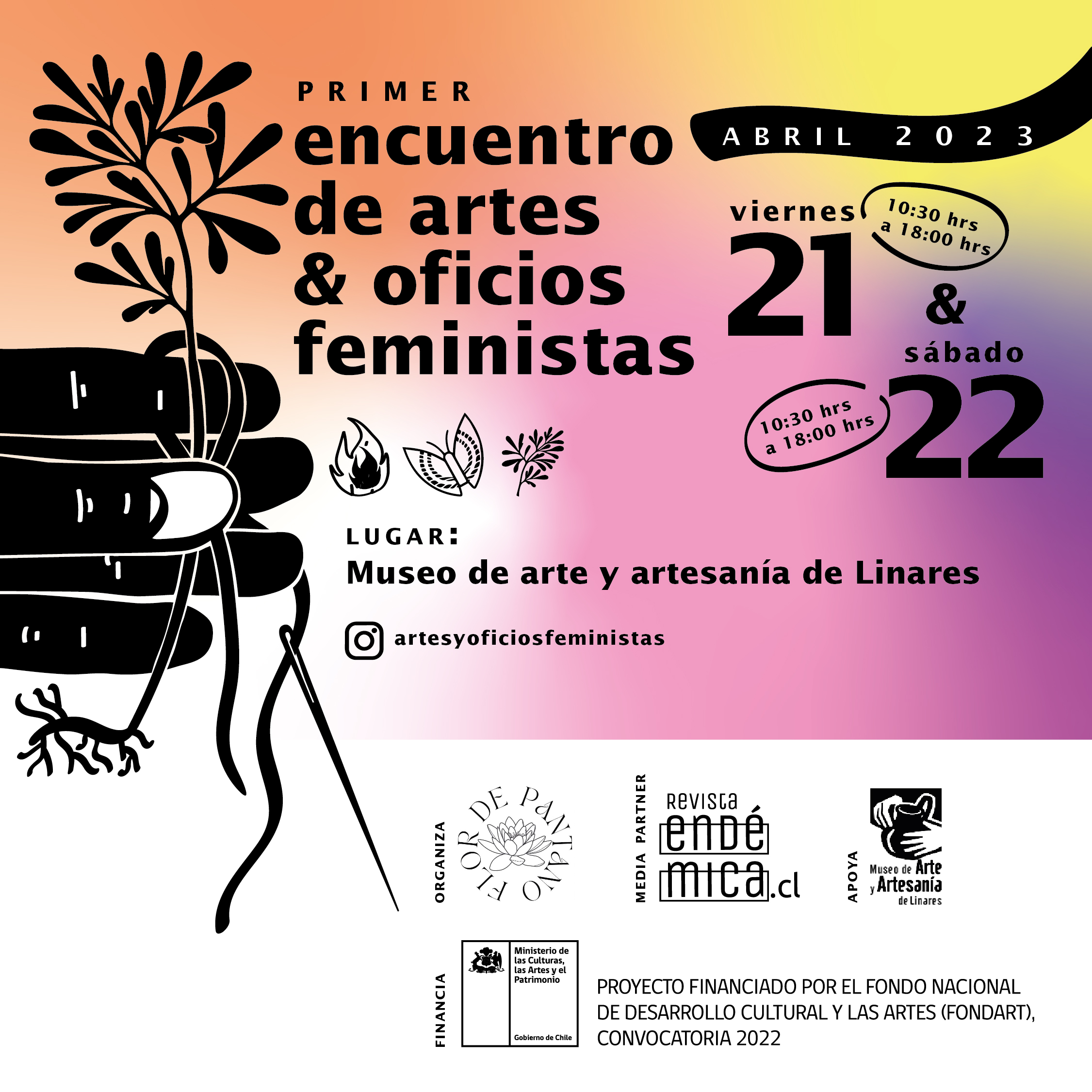 La Agrupación Flor de Pantano te invita a un espacio para promover la equidad de género y la inclusión en el mundo de las artes y oficios. El Encuentro se realizará el viernes 21 y sábado 22 de abril, en el Museo de Arte y Artesanía de Linares, y contará con la participación de destacadas artistas y artesanas de la región.