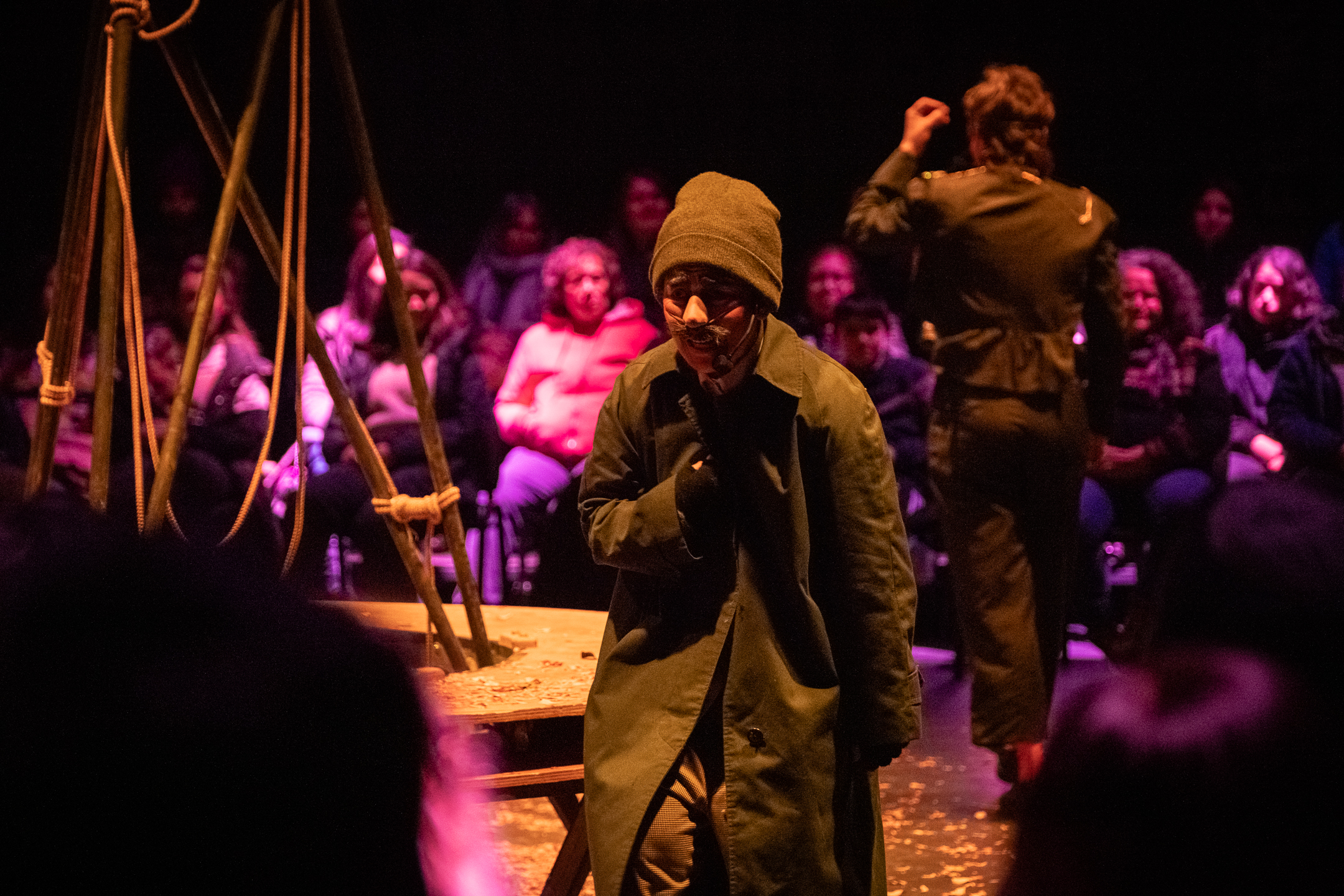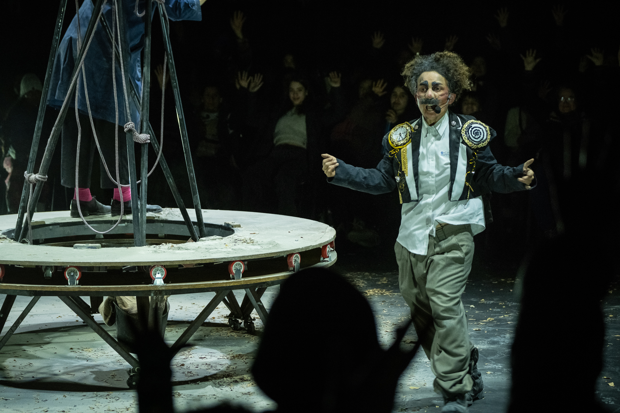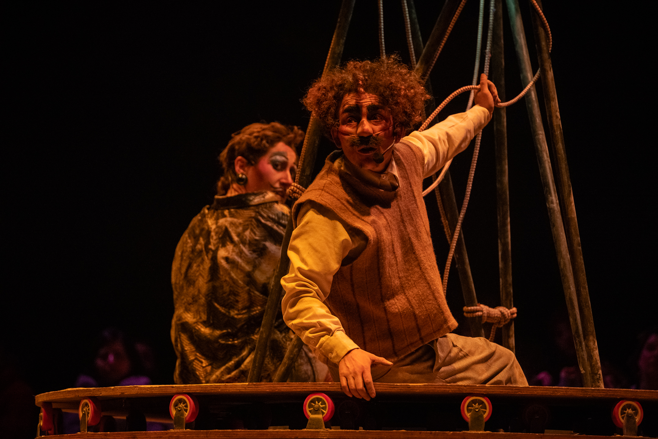 De partida la energía que se siente es avasalladora, dos intérpretes que llenan el escenario, que a su vez comparten con el público que está alrededor siendo parte del espectáculo. Es una propuesta delirante y sutil a la vez, con personajes que nos invitan de manera ácida a reflexionar sobre el sistema que nos impone ritmos y tiempos.