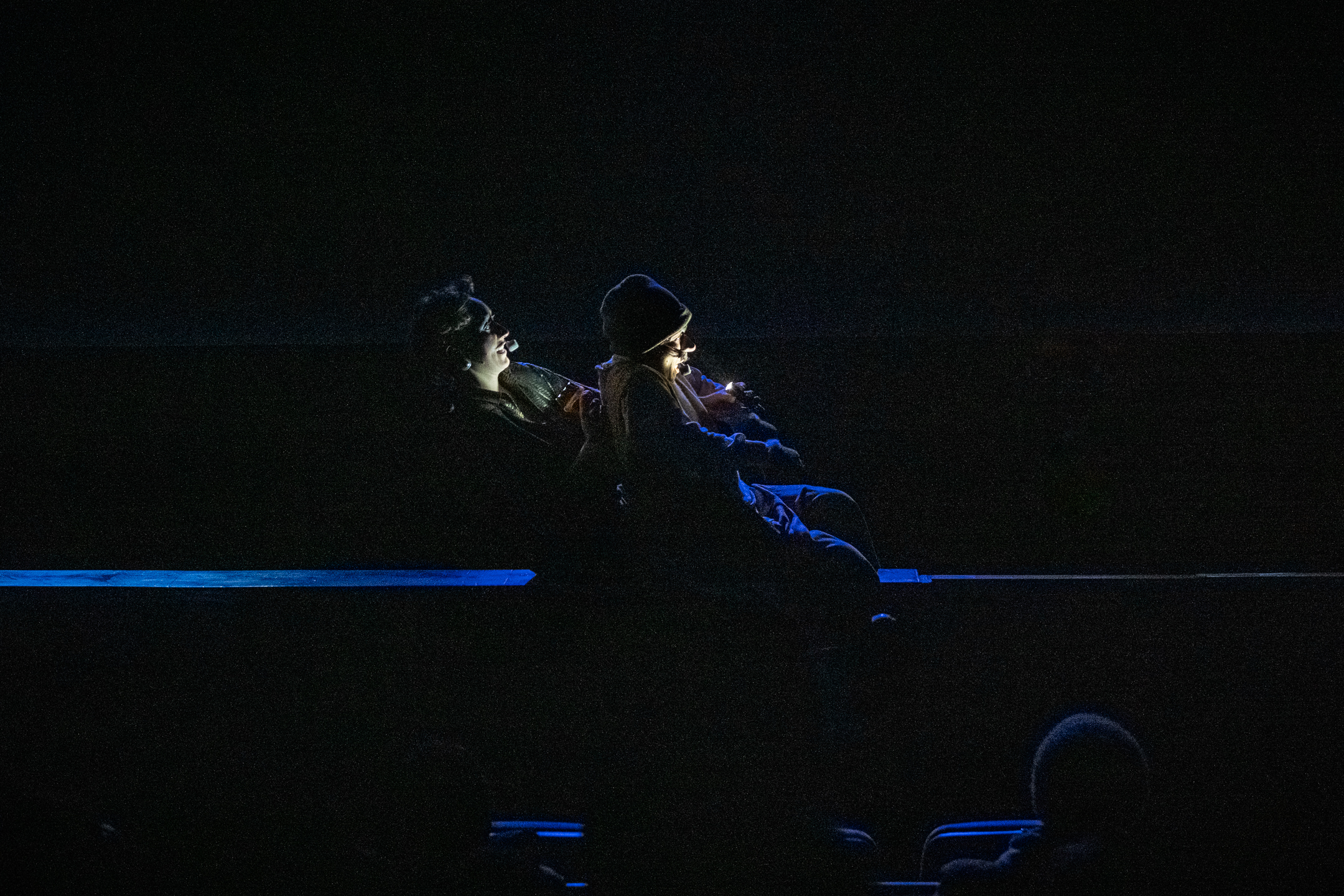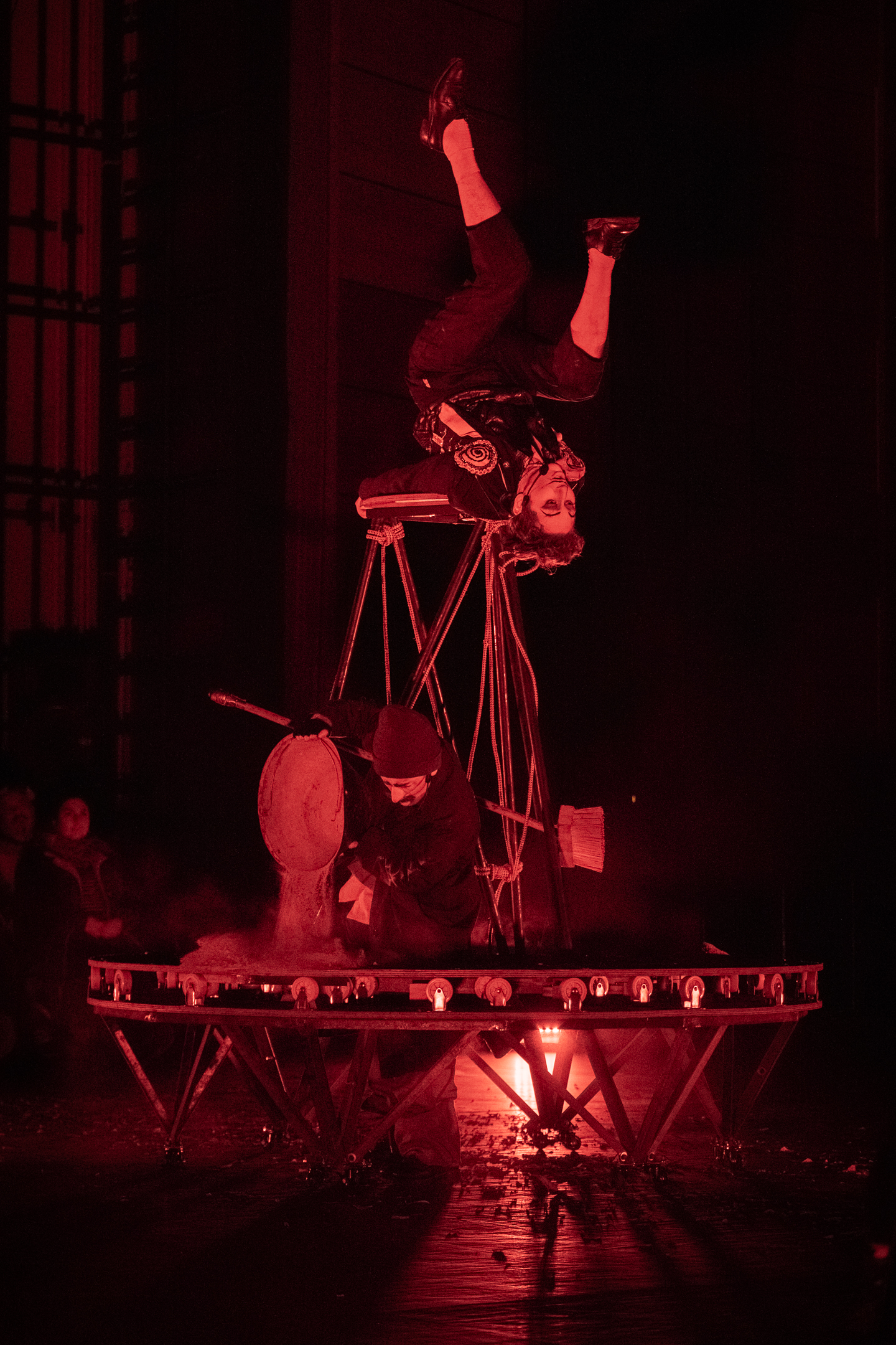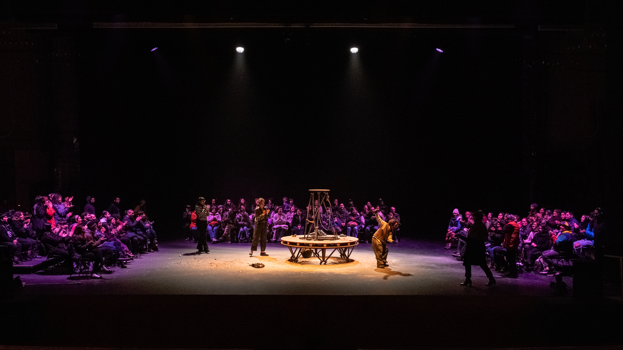 De partida la energía que se siente es avasalladora, dos intérpretes que llenan el escenario, que a su vez comparten con el público que está alrededor siendo parte del espectáculo. Es una propuesta delirante y sutil a la vez, con personajes que nos invitan de manera ácida a reflexionar sobre el sistema que nos impone ritmos y tiempos.
