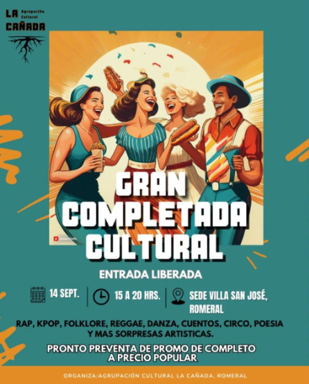 La agrupación cultural “La Cañada”, realizará una completada cultural para los habitantes de la localidad. En la instancia contarán con presentaciones de artistas en variadas disciplinas, ademas de conversar en torno a temáticas tan relevante para Romeral como la importancia del patrimonio, la cultura y el arte en el territorio. La actividad es familiar, libre de humo y alcohol, y los fondos que se recauden irán en ayuda de la fundación La Cañada. La actividad se realizará el sábado 14 de septiembre desde las 15 horas y la entrada es liberada.